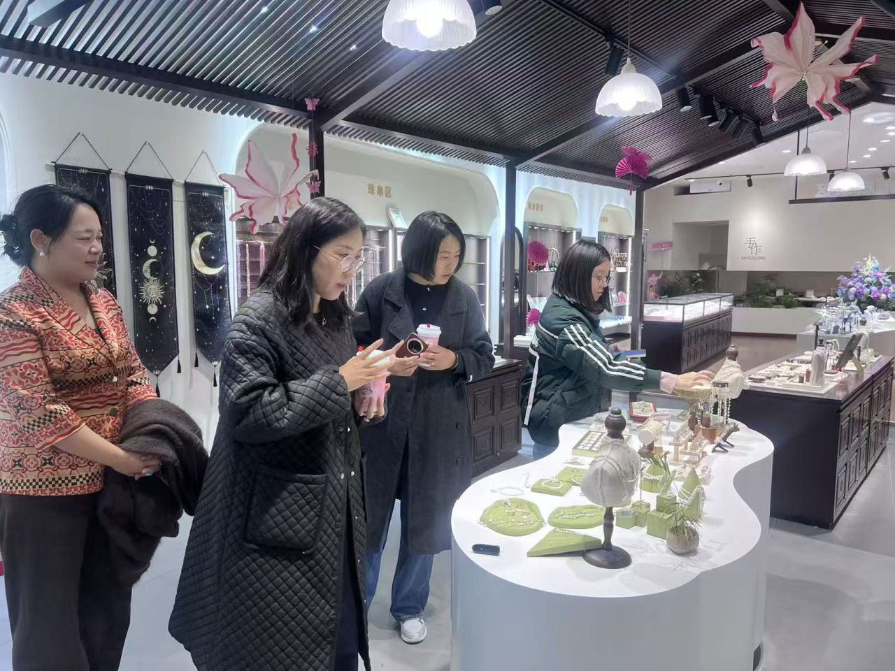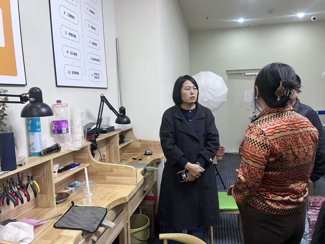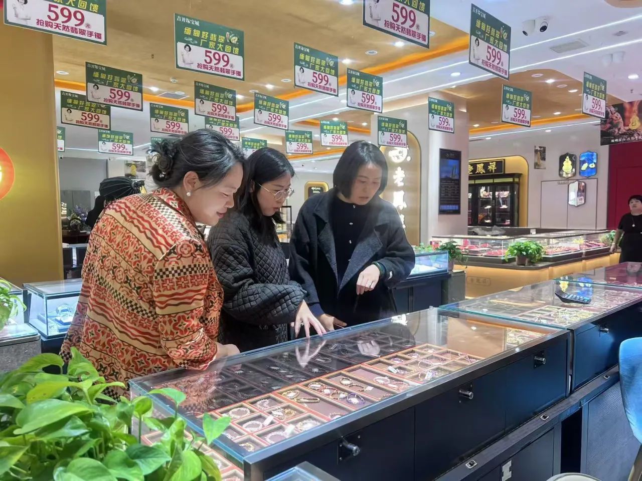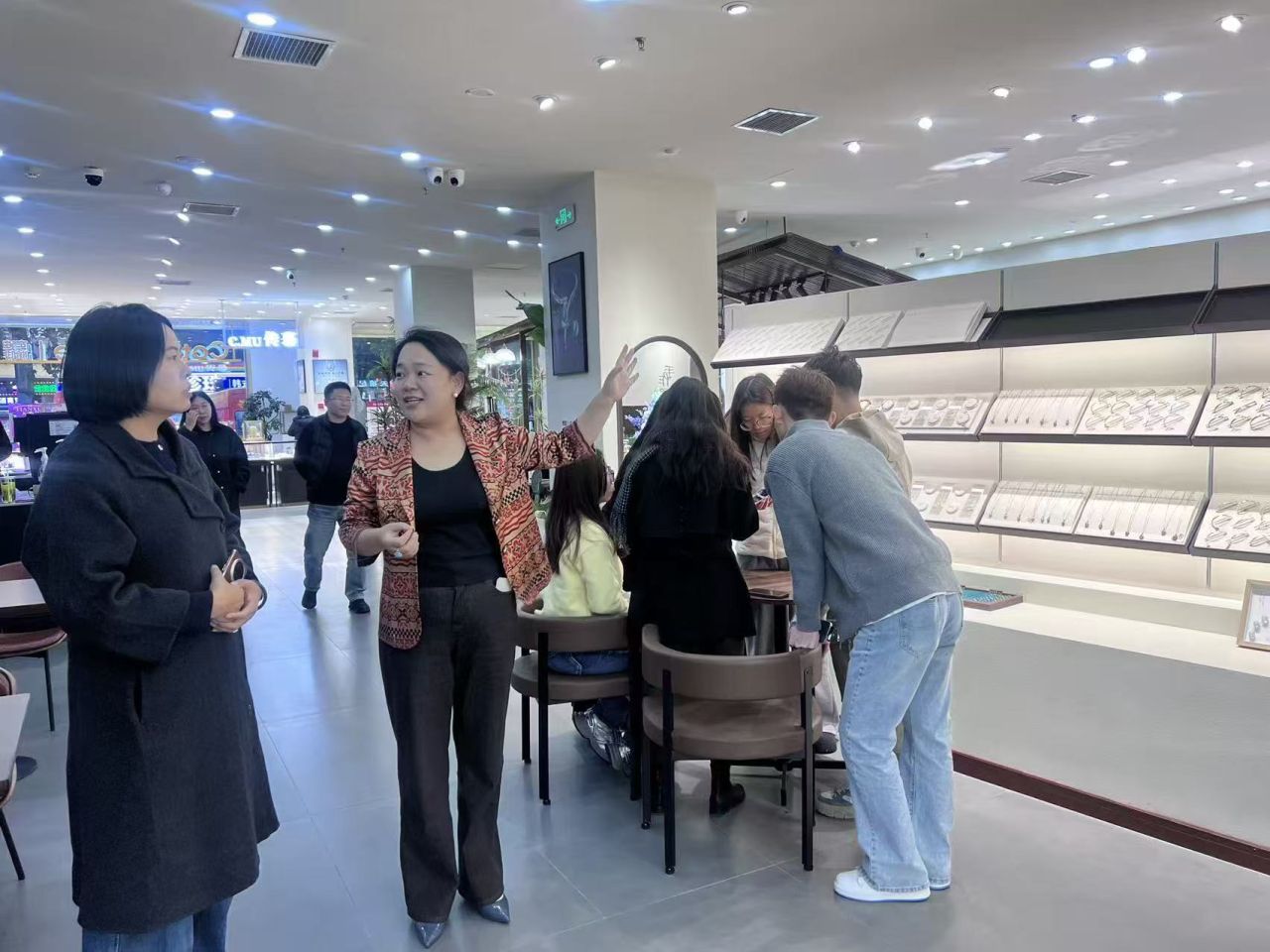 座谈结束后,在石家庄吉开珠宝城管理团队的陪同下,金翠玲副院长、辅导员张曼琳实地参观了珠宝城的产品展示区、定制加工车间、鉴定检测中心与门店运营现场。在定制加工车间,双方就“古法金工艺传承”“新媒体运营”等行业前沿话题展开交流,金翠玲副院长表示,后续必发博彩