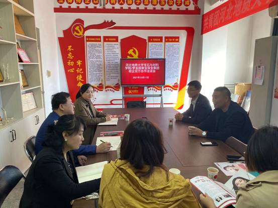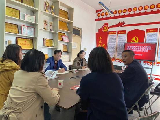 党委书记王旭辉,党委副书记谷月娟,宝石教研室陶隆凤老师,产品设计教研室金翠玲老师,毕业班辅导员张曼琳老师与梦金园黄金珠宝集团人力资源部的刘总和王伟经理在主楼523室就2022届宝石及材料工艺学与产品设计两个专业毕业生的就业方向、人才培养方案、实习基地建设、共同举办国家级设计比赛等问题开展讨论,并进行深度合作达成战略协议。