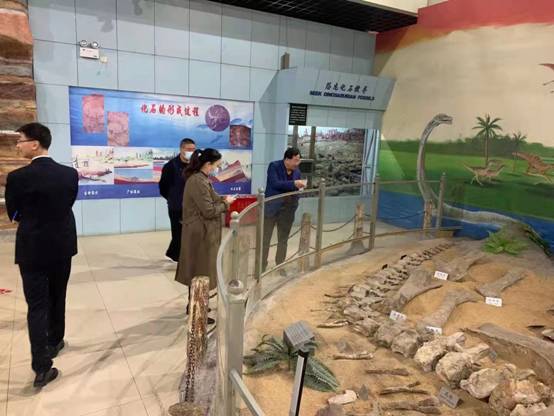 李艳院长、王旭辉书记、梦金园人力资源刘总和王伟经理参观恐龙与古生物厅)