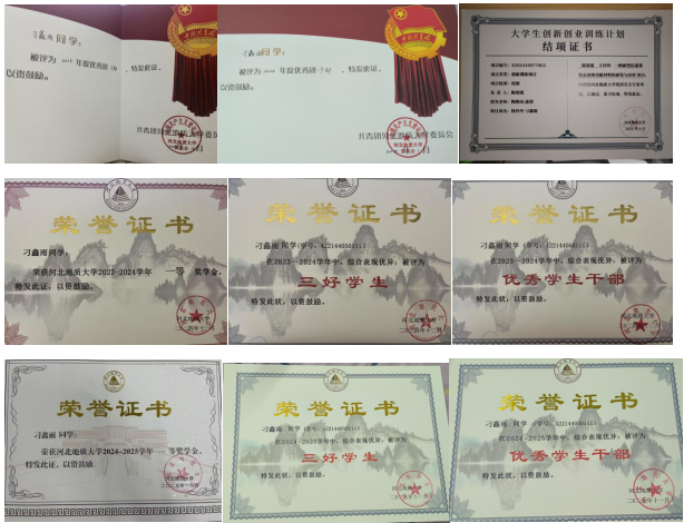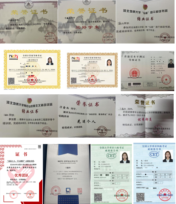 主要荣誉:学业成绩居专业第一,2022-2025连续三年获校一等奖学金、校三好学生,2023-2025连续两年优秀学生干部,2023-2024连续两年优秀团干部,2023年社会实践活动先进个人,2022-2023年度河北地质大学青年志愿者协会优秀部员,河北地质大学第八期青年马克思主义者培训班结业证书,河北地质大学第十期“弘毅”团干部读书班结业证书,2024年全国大学生遵义会议精神志愿宣讲活动优秀团队,大学生创新创业训练计划校级立项,持有英语四级、英语六级、计算机一级、计算机二级、普通话水平测试等级证书及NGTC翡翠鉴定师证书。